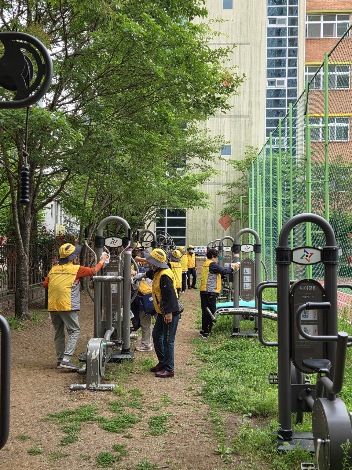 봉사단 회원들은 공원 주변에 버려진 쓰레기수거하고, 운동기구와 놀이기구의 상태를 점검하며